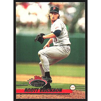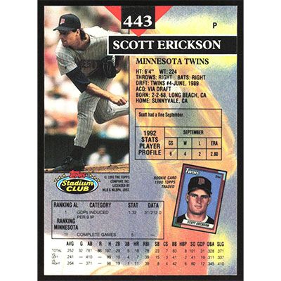 This is a 1993 Stadium Club Scott Erickson baseball card. The card is #443 and pictures show condition.