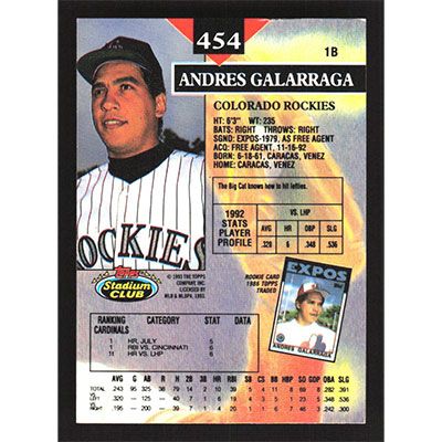 This is a 1993 Stadium Club Andres Galarraga baseball card. The card is #454 and pictures show condition.