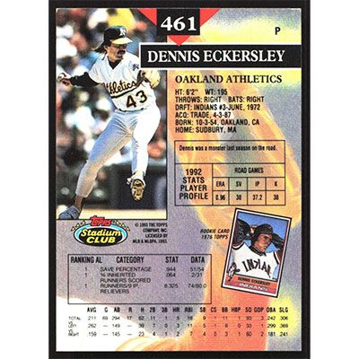 This is a 1993 Stadium Club Dennis Eckersley baseball card. The card is #461 and pictures show condition.