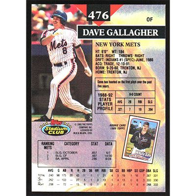 This is a 1993 Stadium Club Dave Gallagher baseball card. The card is #476 and pictures show condition.