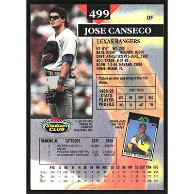 This is a 1993 Stadium Club Jose Canseco baseball card. The card is #499 and pictures show condition.