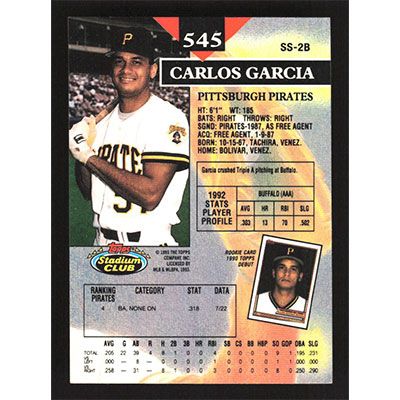 This is a 1993 Stadium Club Carlos Garcia baseball card. The card is #545 and pictures show condition.