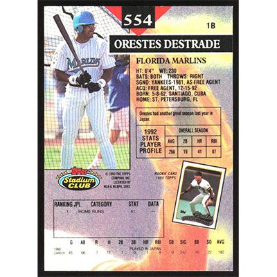 This is a 1993 Stadium Club Orestes Destrade baseball card. The card is #554 and pictures show condition.