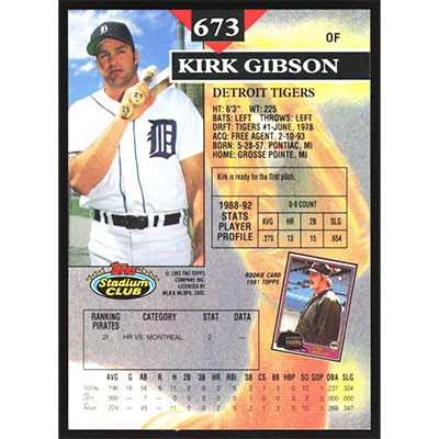 This is a 1993 Stadium Club Kirk Gibson baseball card. The card is #673 and pictures show condition.
