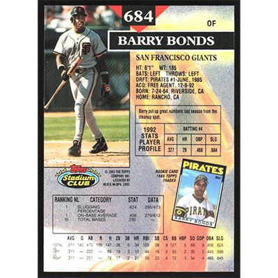 This is a 1993 Stadium Club Barry Bonds baseball card. The card is #684 and pictures show condition.