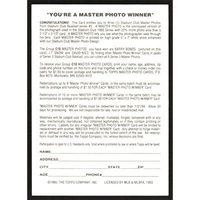 This is a 1993 Stadium Club Master Photos Winners Barry Bonds baseball card. The card is #NNO and pictures show condition. Team(s): San Francisco Giants
