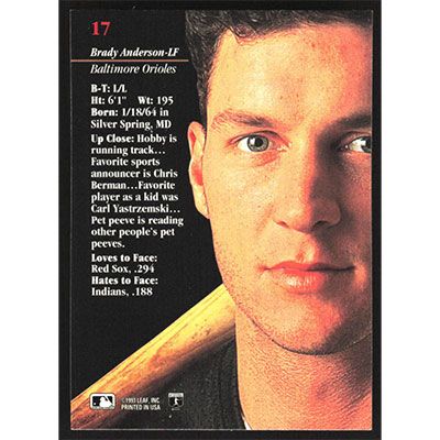 This is a 1993 Studio Brady Anderson baseball card. The card is #17 and pictures show condition.