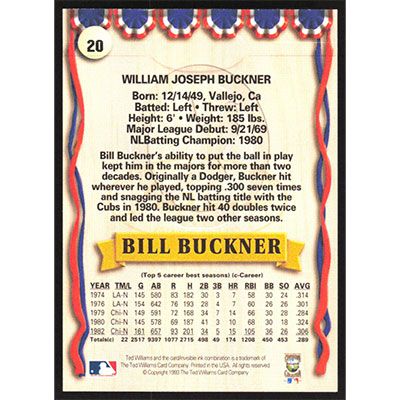 This is a 1993 Ted Williams Bill Buckner baseball card. The card is #20 and pictures show condition.