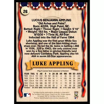 This is a 1993 Ted Williams Luke Appling baseball card. The card is #26 and pictures show condition.