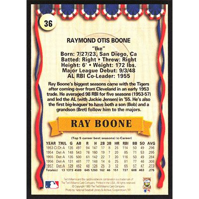 This is a 1993 Ted Williams Ray Boone baseball card. The card is #36 and pictures show condition.