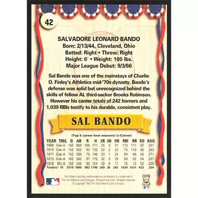 This is a 1993 Ted Williams Sal Bando baseball card. The card is #42 and pictures show condition.