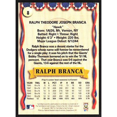 This is a 1993 Ted Williams Ralph Branca baseball card. The card is #8 and pictures show condition.