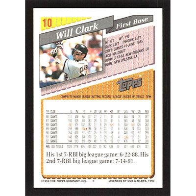 This is a 1993 Topps Will Clark baseball card. The card is #10 and pictures show condition.