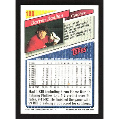 This is a 1993 Topps Darren Daulton baseball card. The card is #180 and pictures show condition.