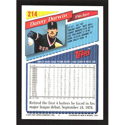 This is a 1993 Topps Danny Darwin baseball card. The card is #214 and pictures show condition.