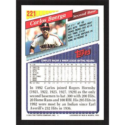 This is a 1993 Topps Carlos Baerga autographed baseball card. This card has been signed, in blue, by Carlos Baerga, and is guaranteed authentic by Ballcardz.com. The card is #221 and pictures show condition.
