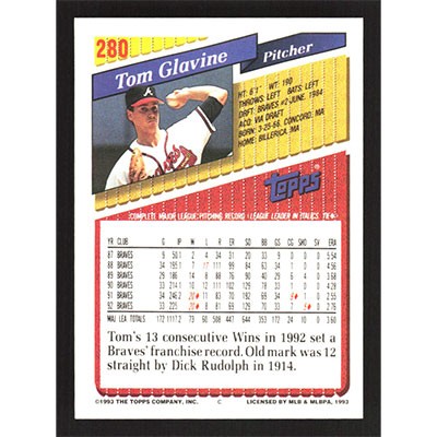 This is a 1993 Topps Tom Glavine baseball card. The card is #280 and pictures show condition.
