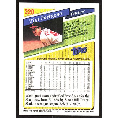 This is a 1993 Topps Tim Fortugno baseball card. The card is #320 and pictures show condition.