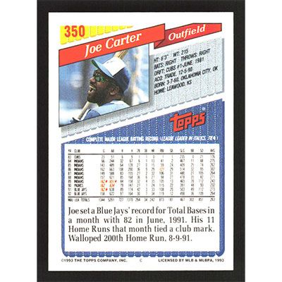 This is a 1993 Topps Joe Carter baseball card. The card is #350 and pictures show condition.