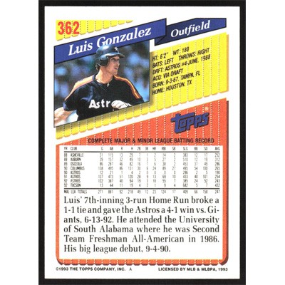 This is a 1993 Topps Luis Gonzalez baseball card. The card is #362 and pictures show condition.