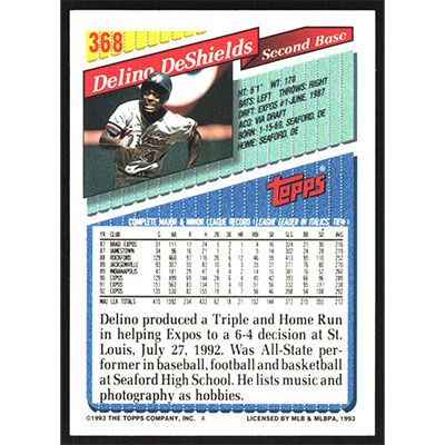 This is a 1993 Topps Delino DeShields baseball card. The card is #368 and pictures show condition.