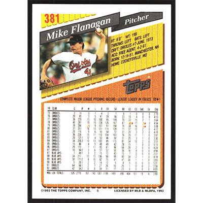 This is a 1993 Topps Mike Flanagan baseball card. The card is #381 and pictures show condition.