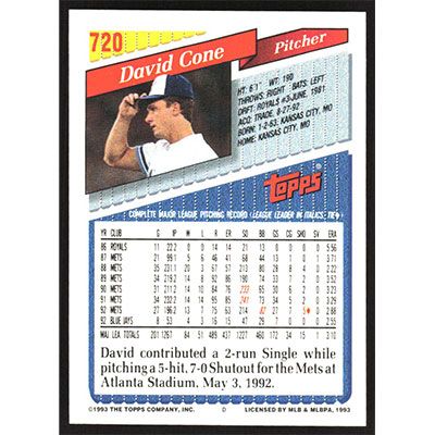 This is a 1993 Topps David Cone baseball card. The card is #720 and pictures show condition.