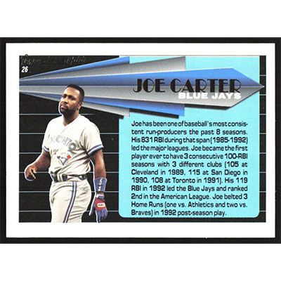 This is a 1993 Topps Black Gold Joe Carter baseball card. The card is #26 and pictures show condition.