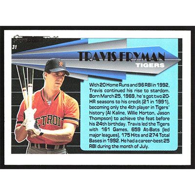 This is a 1993 Topps Black Gold Travis Fryman baseball card. The card is #31 and pictures show condition.