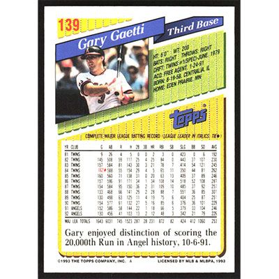 This is a 1993 Topps Gold Gary Gaetti baseball card. The card is #139 and pictures show condition.