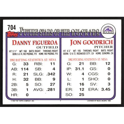 This is a 1993 Topps Gold Jon Goodrich/Danny Figueroa Future Stars baseball card. The card is #704 and pictures show condition.