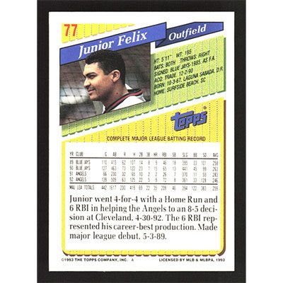 This is a 1993 Topps Gold Junior Felix baseball card. The card is #77 and pictures show condition.