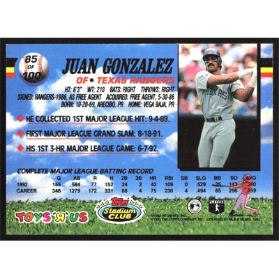 This is a 1993 Toys 'R' Us Juan Gonzalez baseball card. The card is #85 and pictures show condition.