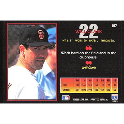 This is a 1993 Triple Play Will Clark baseball card. The card is #107 and pictures show condition.