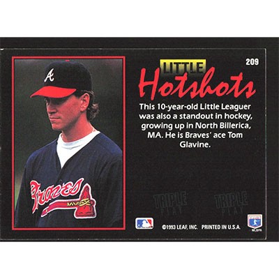 This is a 1993 Triple Play Tom Glavine Little Hotshots baseball card. The card is #209 and pictures show condition.