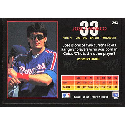 This is a 1993 Triple Play Jose Canseco baseball card. The card is #243 and pictures show condition.