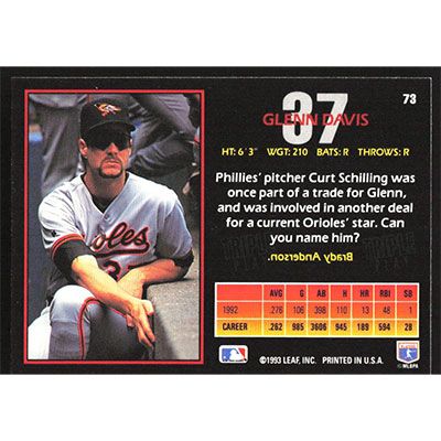 This is a 1993 Triple Play Glenn Davis baseball card. The card is #73 and pictures show condition.