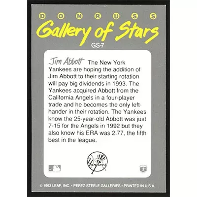 This is a 1993 Triple Play Gallery of Stars Jim Abbott baseball card. The card is #GS-7 and pictures show condition.
