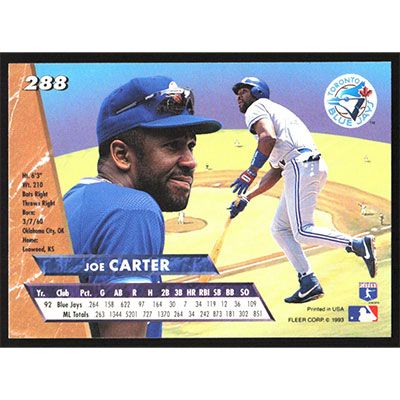 This is a 1993 Ultra Joe Carter baseball card. The card is #288 and pictures show condition.