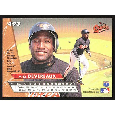This is a 1993 Ultra Mike Devereaux baseball card. The card is #493 and pictures show condition.