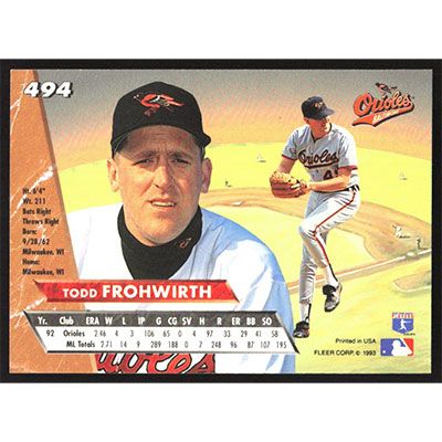 This is a 1993 Ultra Todd Frohwirth baseball card. The card is #494 and pictures show condition.