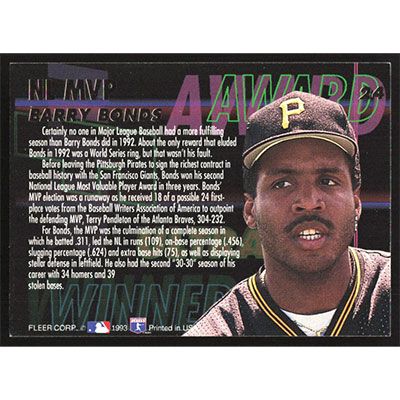 This is a 1993 Ultra Award Winners Barry Bonds baseball card. The card is #24 and pictures show condition.