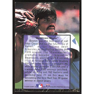 This is a 1993 Ultra Dennis Eckersley Career Highlights Dennis Eckersley baseball card. The card is #4 and pictures show condition. Team(s): Boston Red Sox