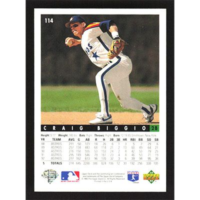 This is a 1993 Upper Deck Craig Biggio baseball card. The card is #114 and pictures show condition.