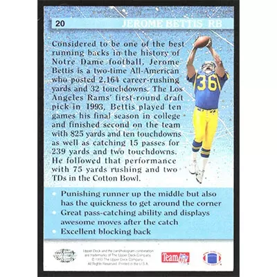 This is a 1993 Upper Deck Jerome Bettis Star Rookie football card. The card is #20 and pictures show condition.