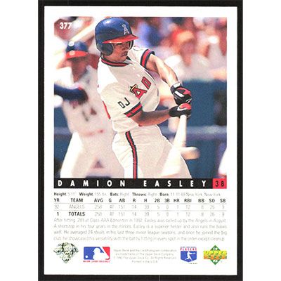 This is a 1993 Upper Deck Damion Easley baseball card. The card is #377 and pictures show condition.