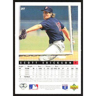 This is a 1993 Upper Deck Scott Erickson baseball card. The card is #397 and pictures show condition.