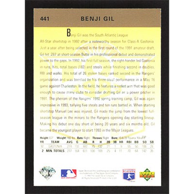 This is a 1993 Upper Deck Benji Gil Top Prospect baseball card. The card is #441 and pictures show condition.