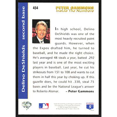 This is a 1993 Upper Deck Delino DeShields Inside the Numbers baseball card. The card is #454 and pictures show condition.