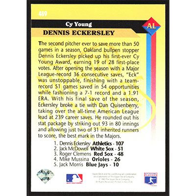 This is a 1993 Upper Deck Dennis Eckersley Award Winner baseball card. The card is #489 and pictures show condition.